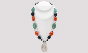 Turquoise, Orange Coral, Onyx with Rock Crsytal Faceted Pendant Necklace